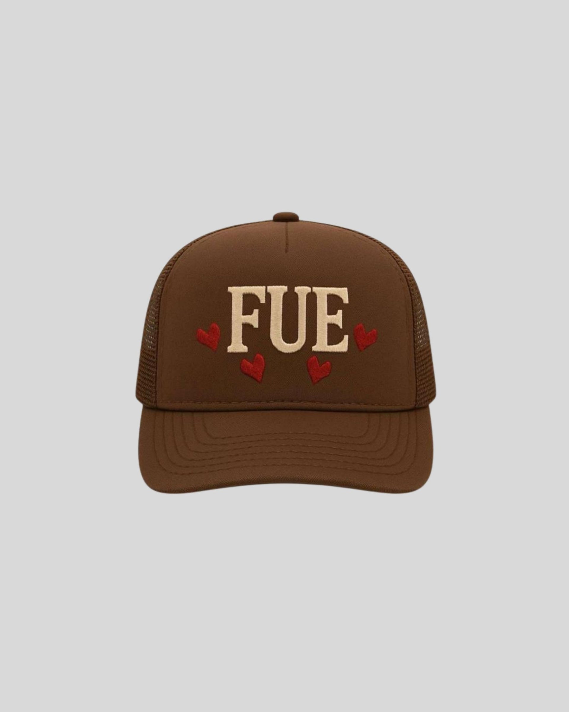 The Pookie Hat is a stylish brown trucker cap featuring bold “FUE” lettering with 3D embroidery and red heart accents. Made with breathable mesh and an adjustable snapback, it blends comfort with trendy streetwear appeal....