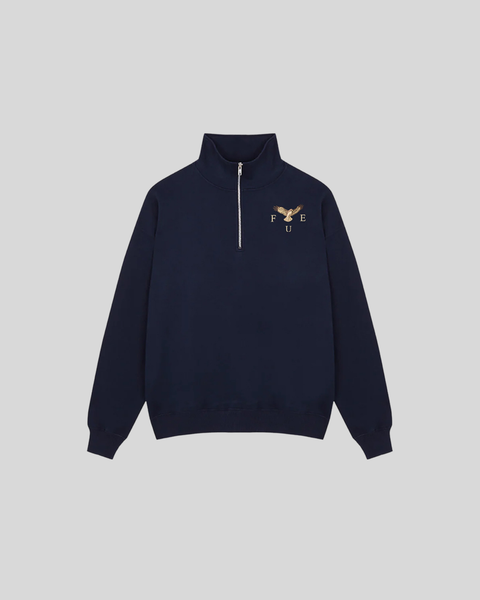 Stay sharp and grounded in the Flight Quarter Zip for men. This navy essential features a bold golden eagle graphic and “FUE” lettering at the chest. With its sleek zip-up collar, it’s the perfect blend of comfort and confidence.