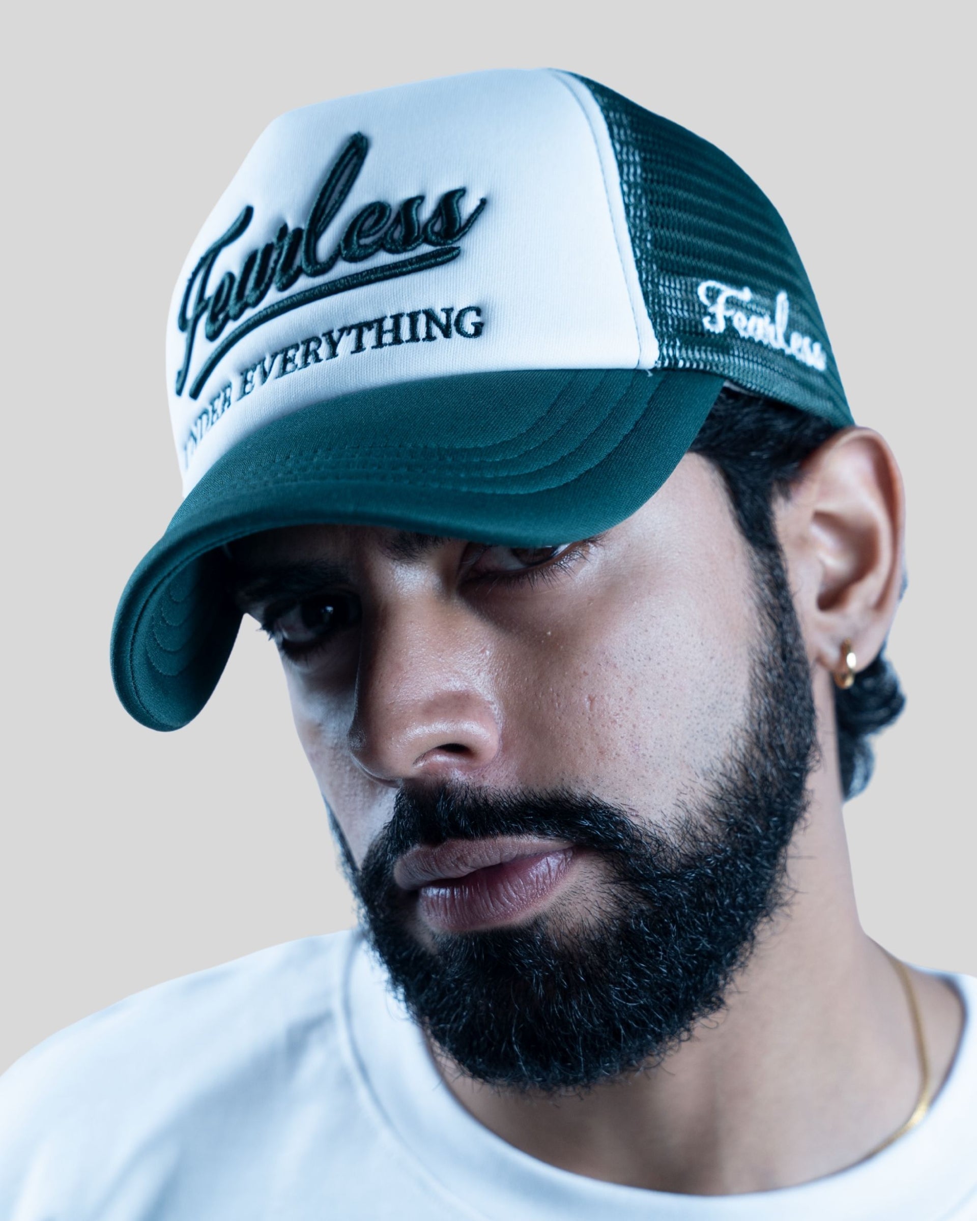Make a bold statement with the Fearless Trucker Hat, featuring striking 3D embroidered text: "Fearless Under Everything." This green and white cap combines breathable mesh with a structured front and adjustable fit, offering all-day comfort. A perfect unisex streetwear piece for confident, everyday style.